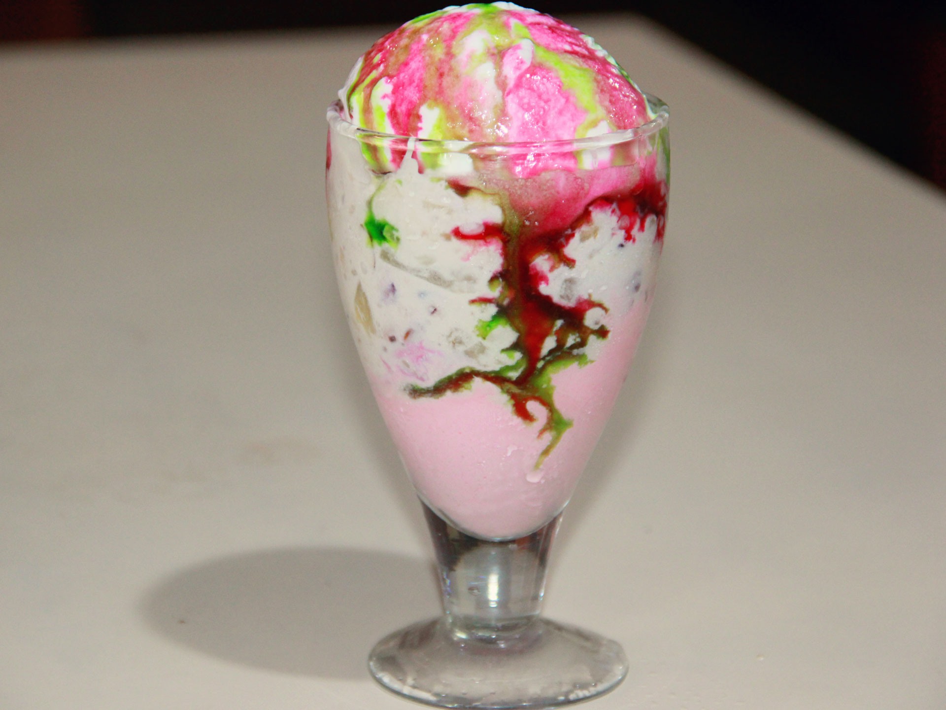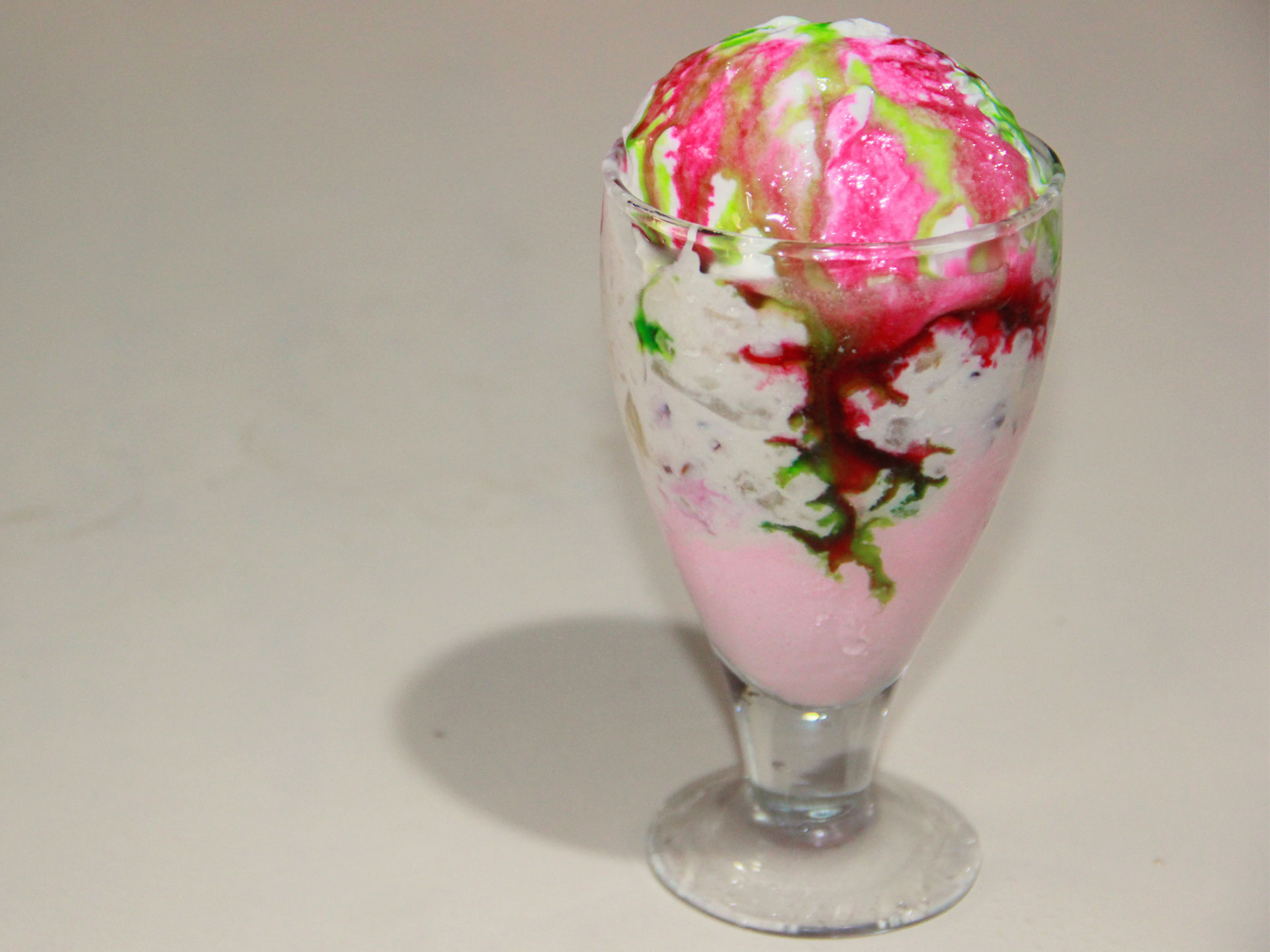 The melt in mouth Tutti Fruitti Ice Cream prepared from American Nuts and Kesar ice creams, garnished with dry-fruits, milk cream etc.and topped with rose and Kesar (saffron) Sharbats (sweetened drinks prepared from fruits and flower petals) is a unique sweet variety of ice cream. The taste is available from 08:00 a.m. to 02:00 a.m.What is Frozen Desserts & Ice cream