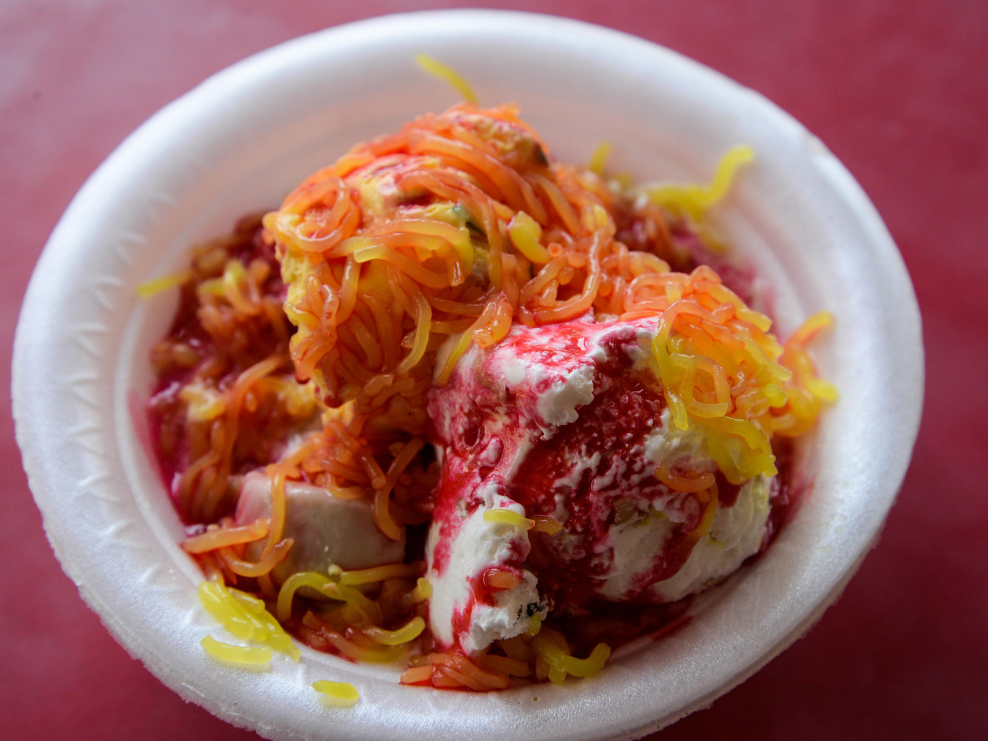 The Falooda added with milk, topped up with chilled ice-cream and garnished with dry nuts is a very delicious sweet delicacy with a nice flavor.What is Falooda