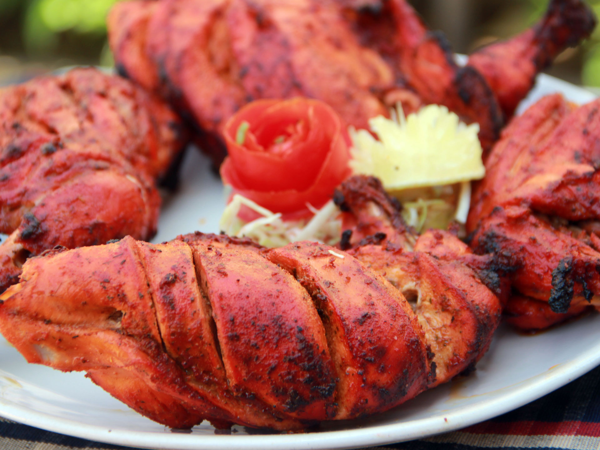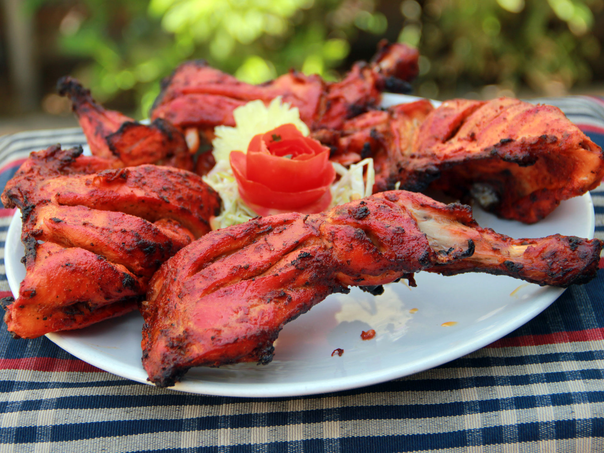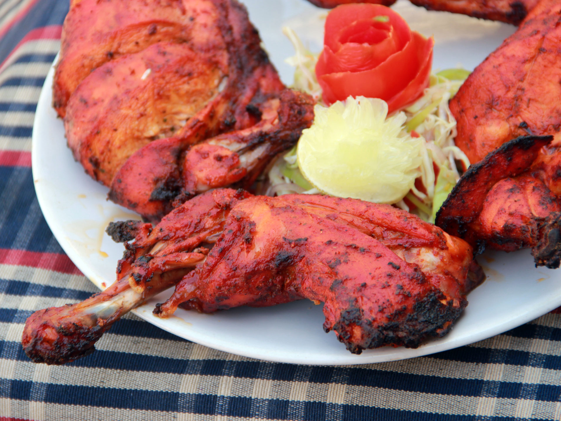 The delicious Tandoori Chicken prepared by marinating the fresh chicken pieces for long hours in the curd, shallow-fried gram flour and seasoned with spices, like- garlic, ginger, Daal Chini (cinnamon), red chili powder, salt, dried fenugreek, Garam Masala (assortment of several spices), red and orange color, and roasted on a Tandoor (traditional earthen oven) is a spicy poultry delicacy. It is served hot with Salad comprised of sliced tomato, onion, cabbage, cucumber, lemon etc. The taste is available from 08:00 a.m. to 11:00 p.m.What is Tandoori Chicken