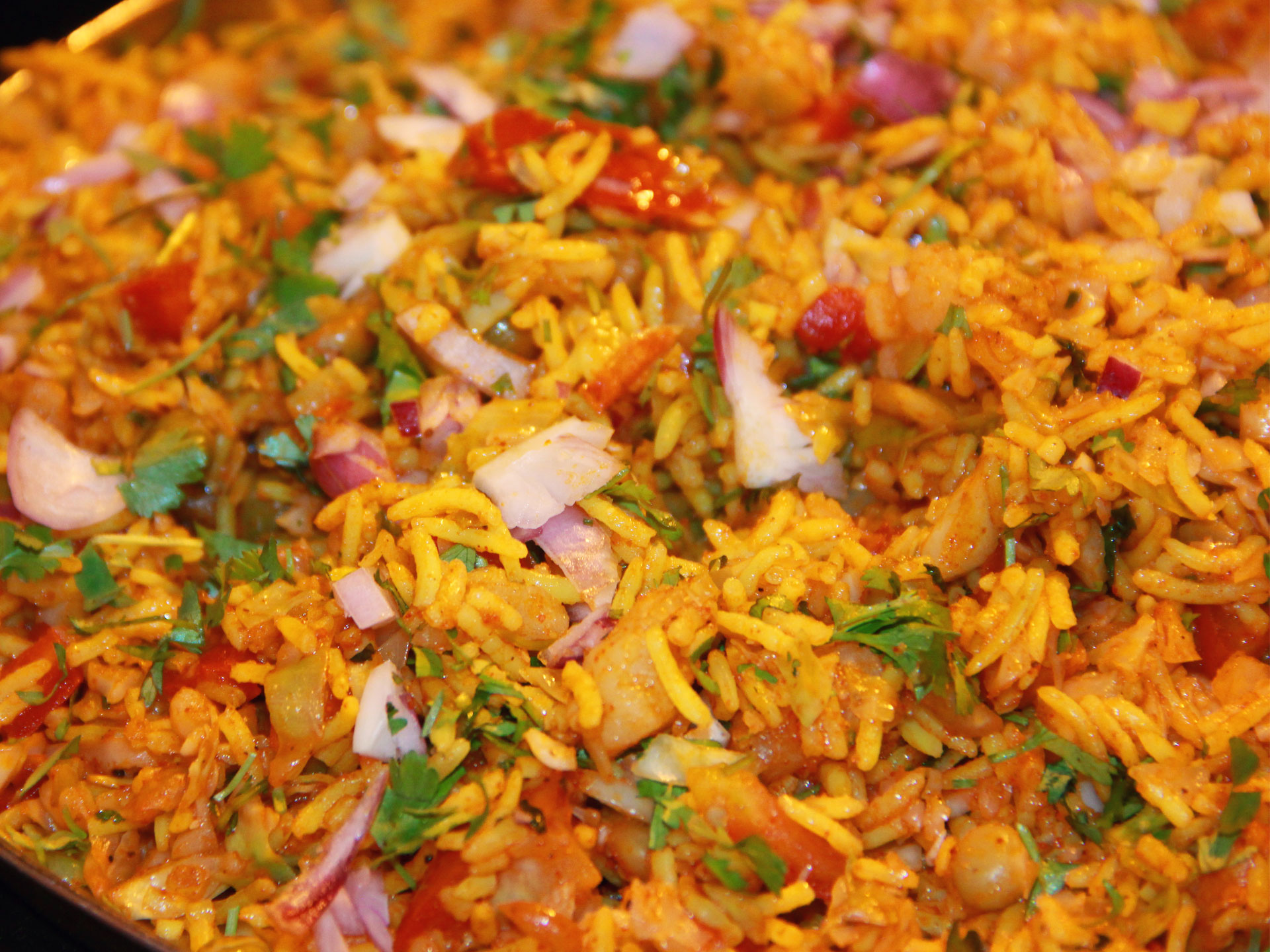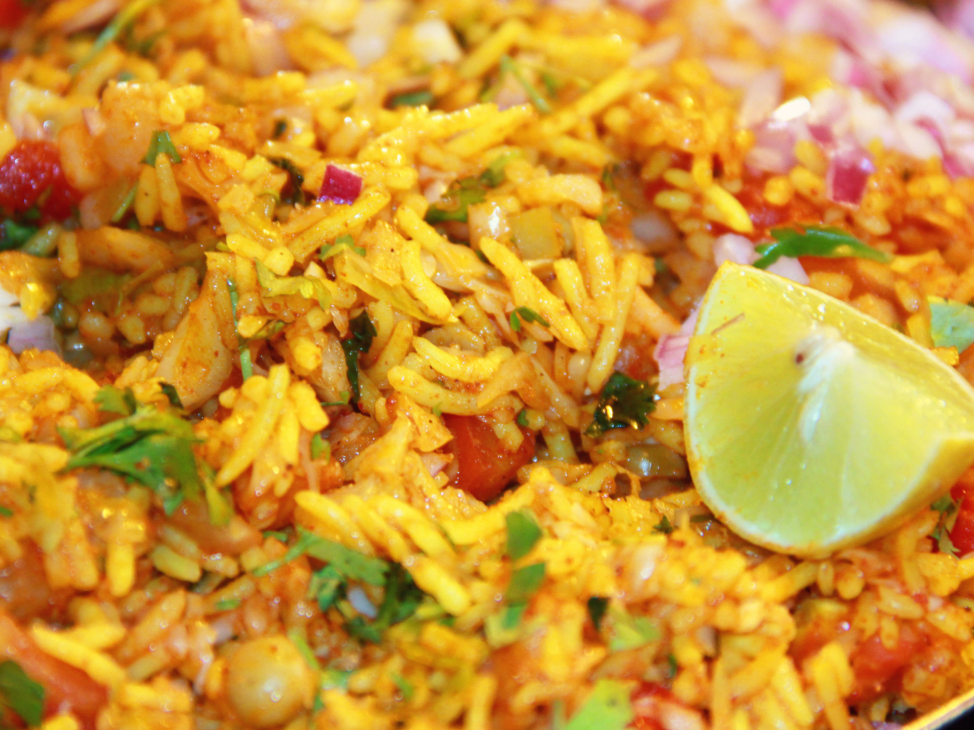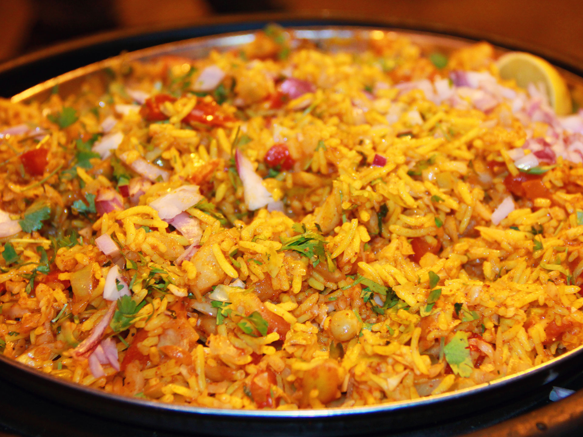 This delectable Pulao (fried rice) prepared using water soaked fragrant Basmati rice, cabbage, potatoes, tomatoes, green peas, onions, green chilies etc. fried with normal spices- salt, red chili powder, turmeric, ground coriander and garnished with Paav Bhaaji Masala, coriander leaves and squeeze of lemon etc. is a spicy delicacy.What is Rice
