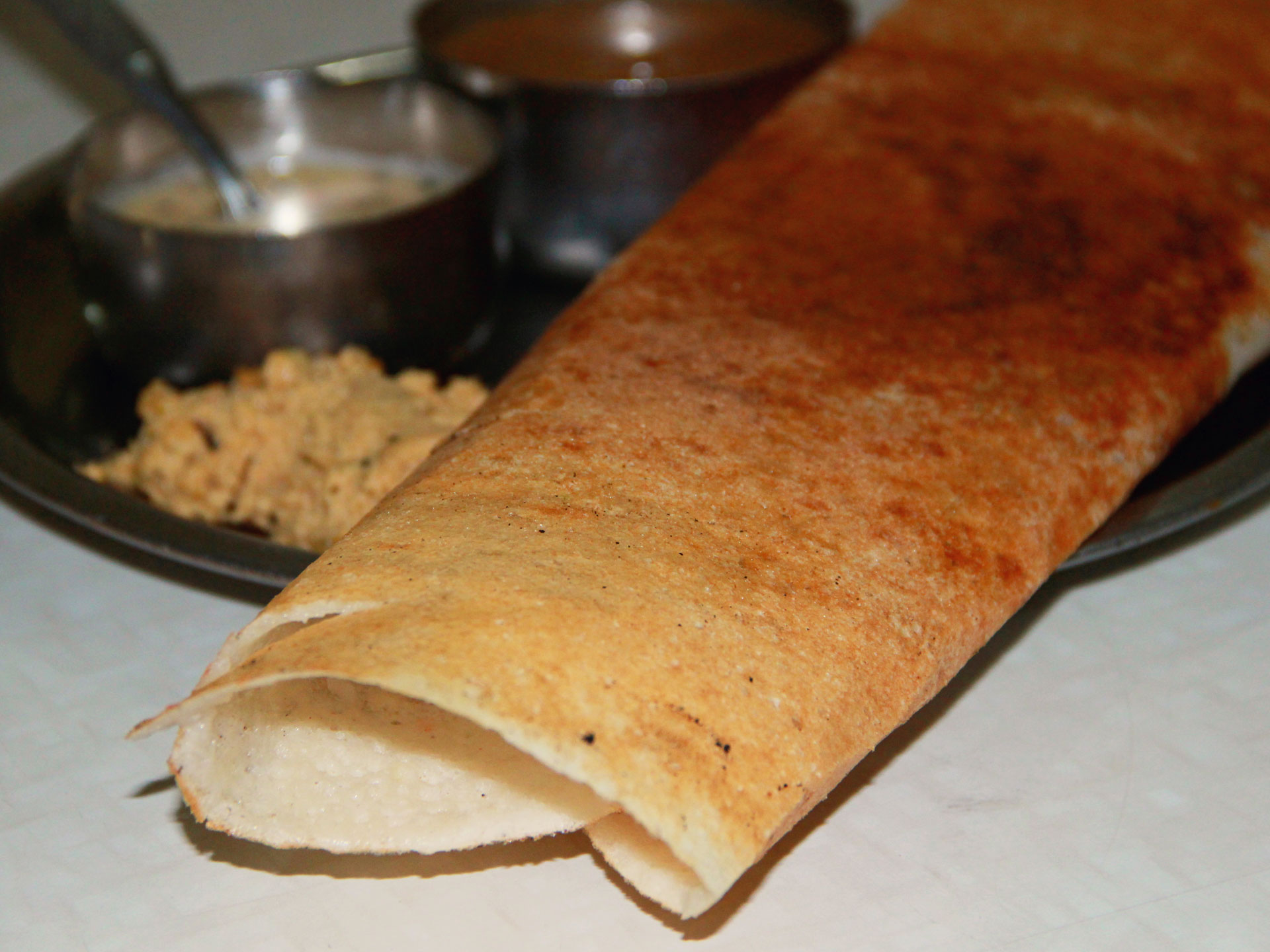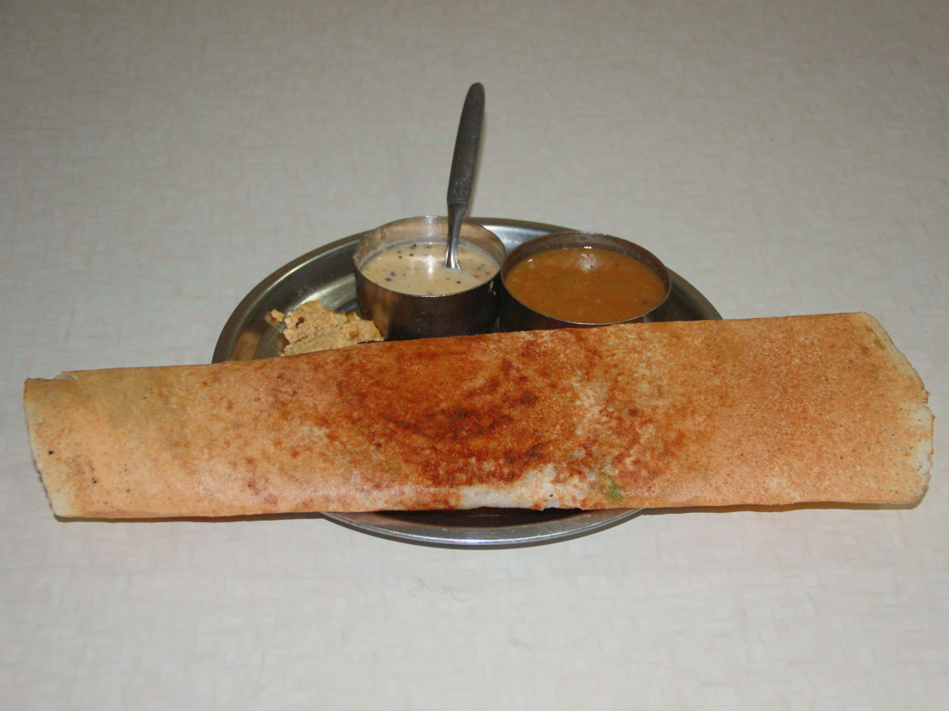 Apart from the common support dishes (sambar and coconut chutney) they also provide a fiery hot chutney made from garlic and red chili. This spices up the light taste of Masala Dosa.The Taste