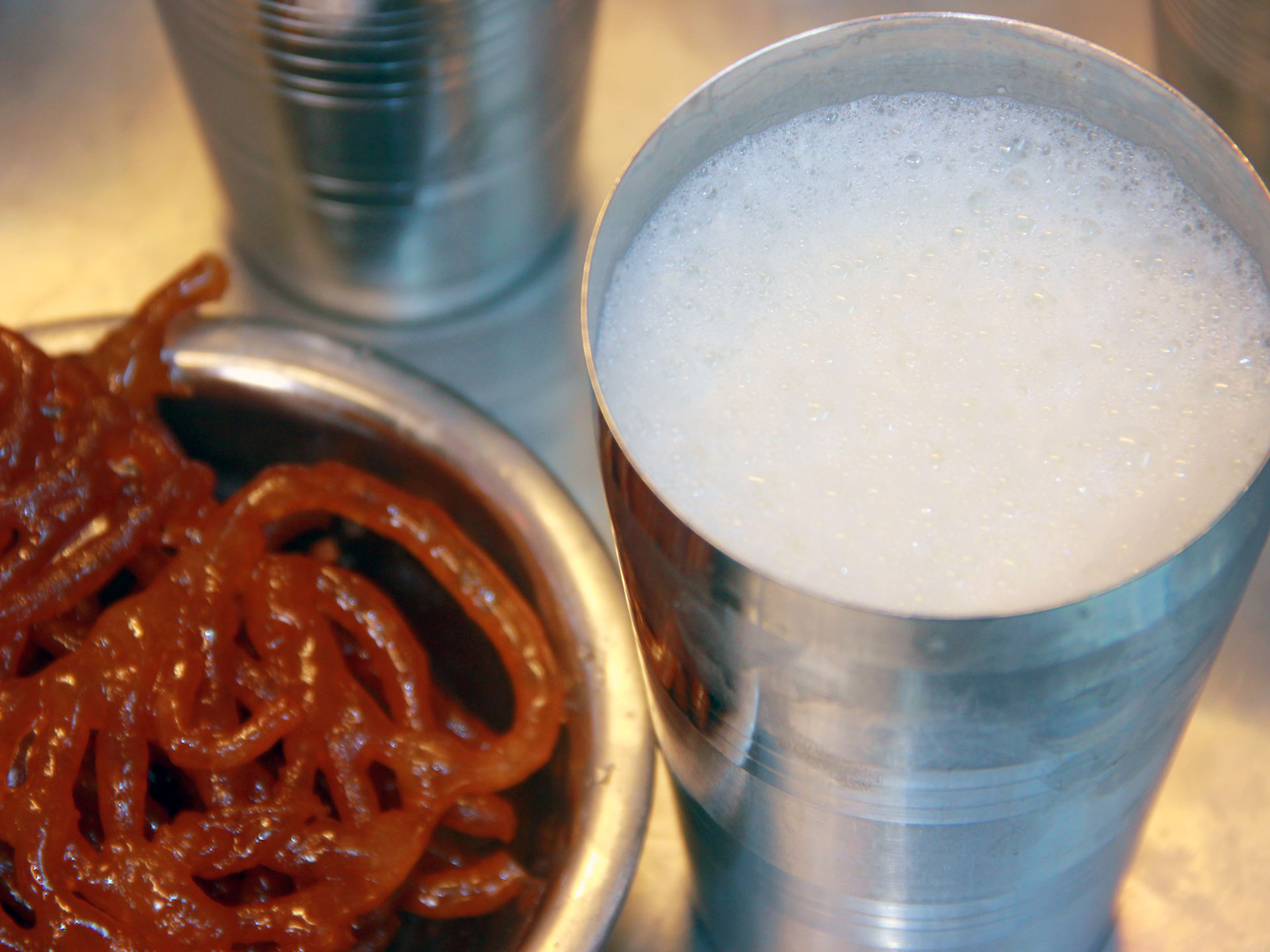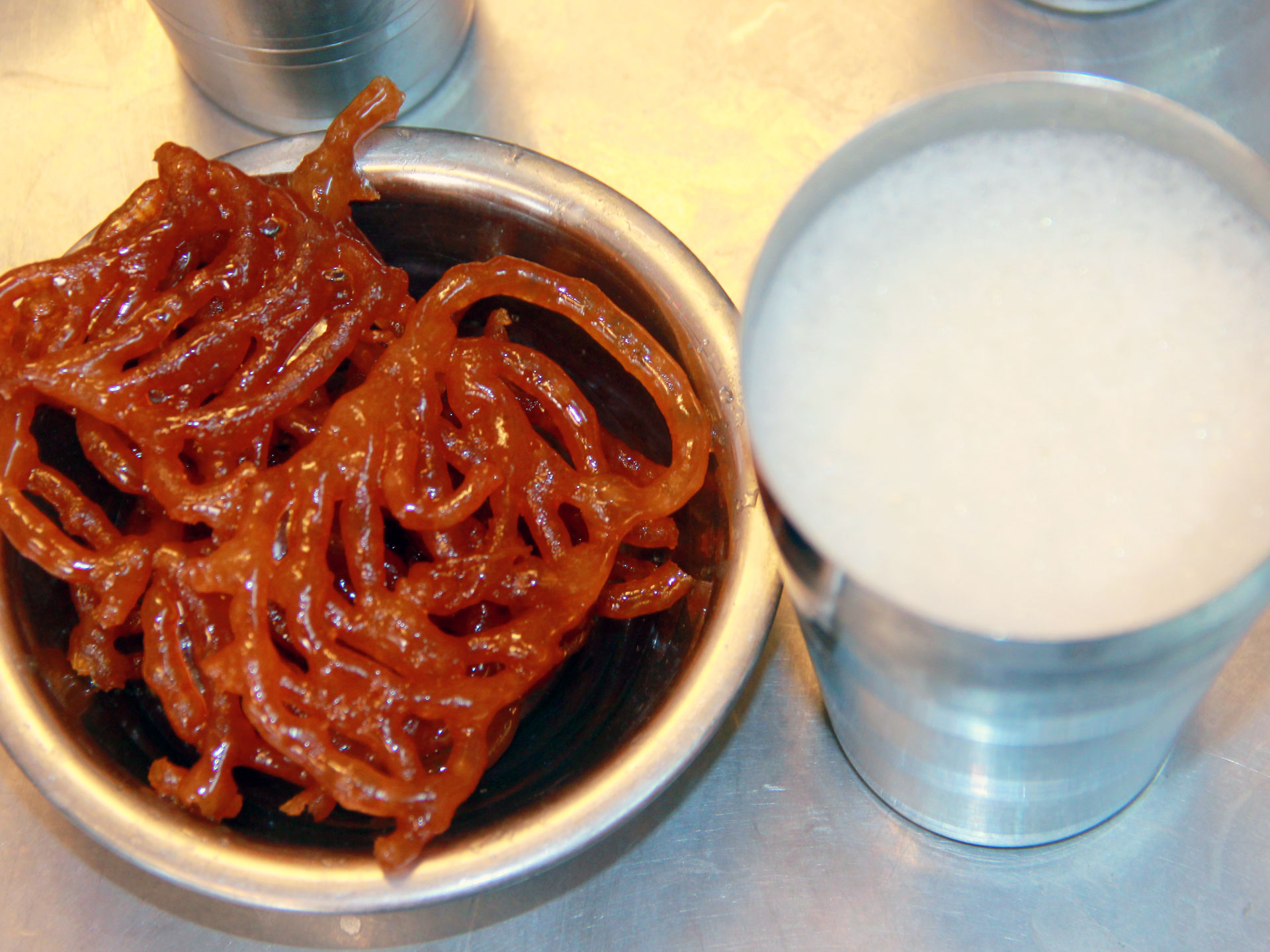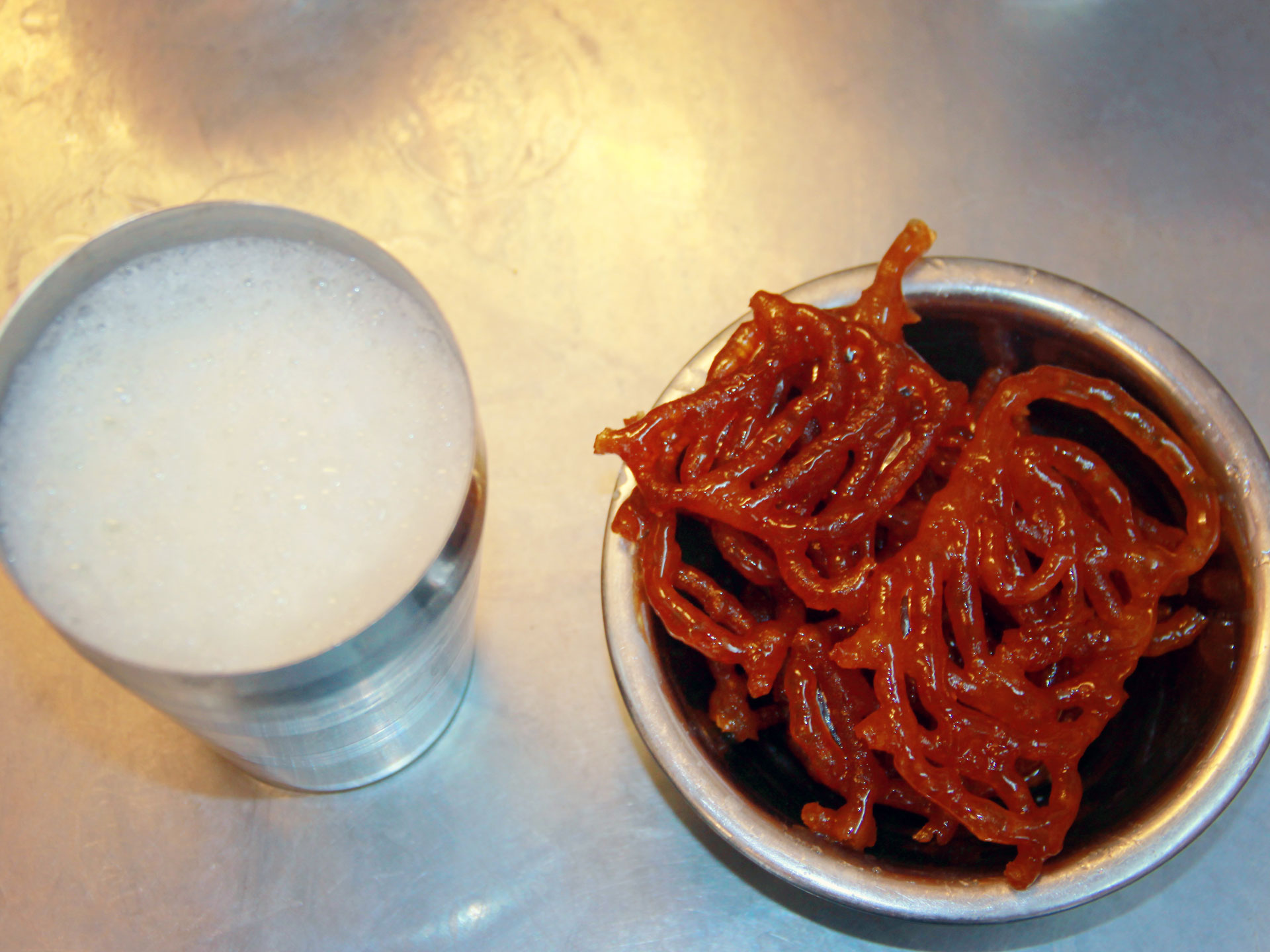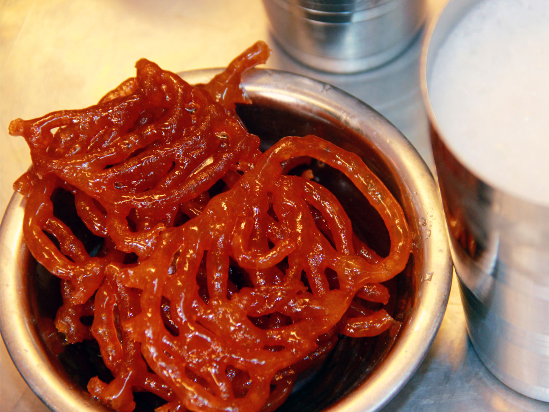The flavorful Jalebi made by deep-frying batter of leavened fine wheat flour (Maida) in circular shapes in pure Desi Ghee (clarified butter) and dipped in a sugary syrup (Chashani) is a luscious delicacy relished with the lukewarm milk making it a wholesome treat. The taste is normally available from 07:00 A.M. to 01:00 P.M.What is Jalebee / Jalebi