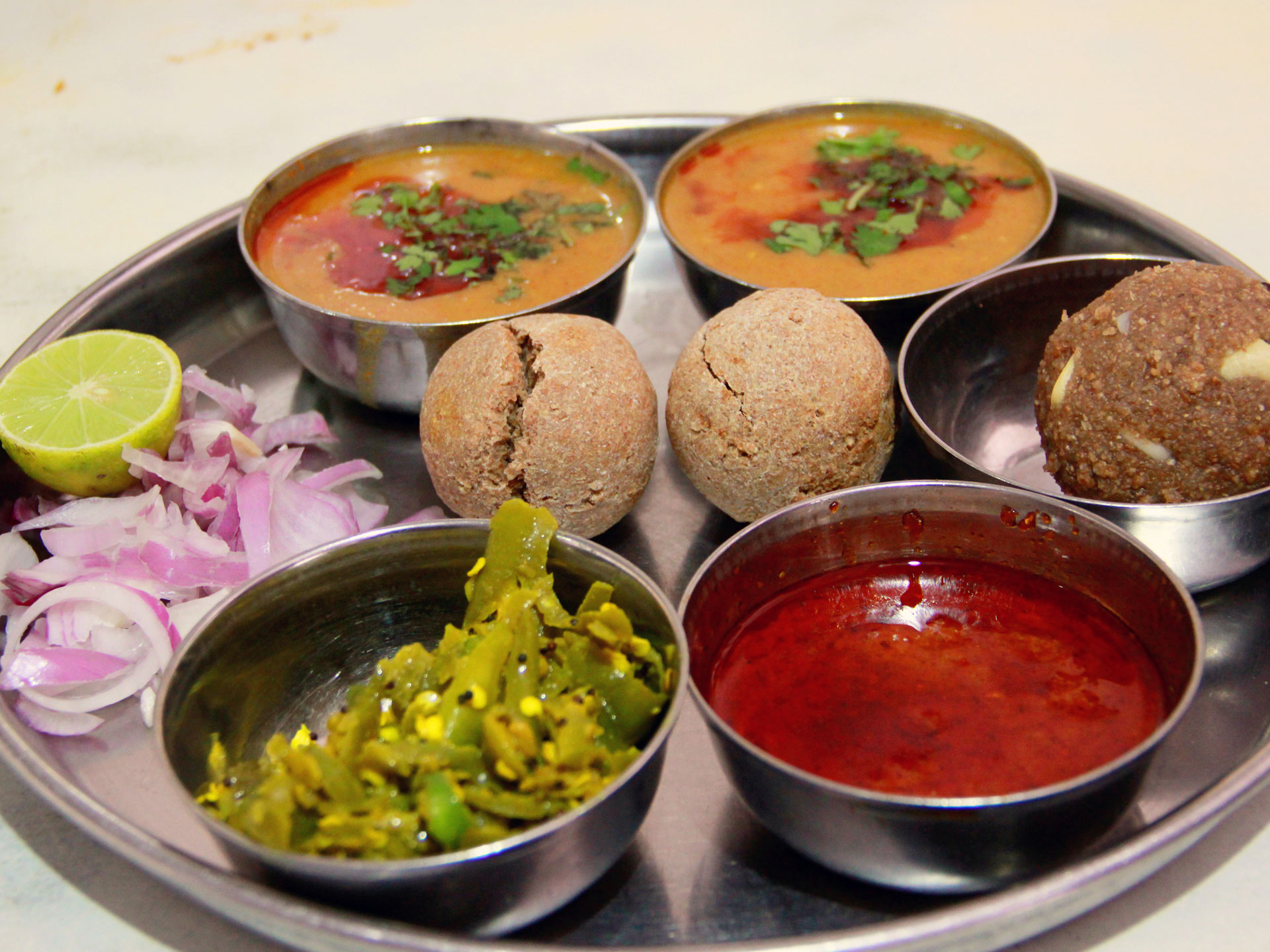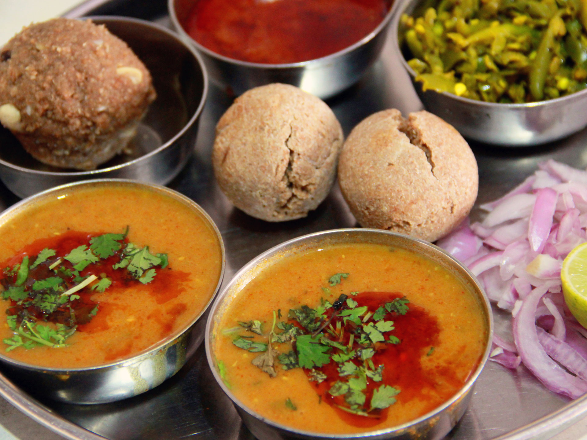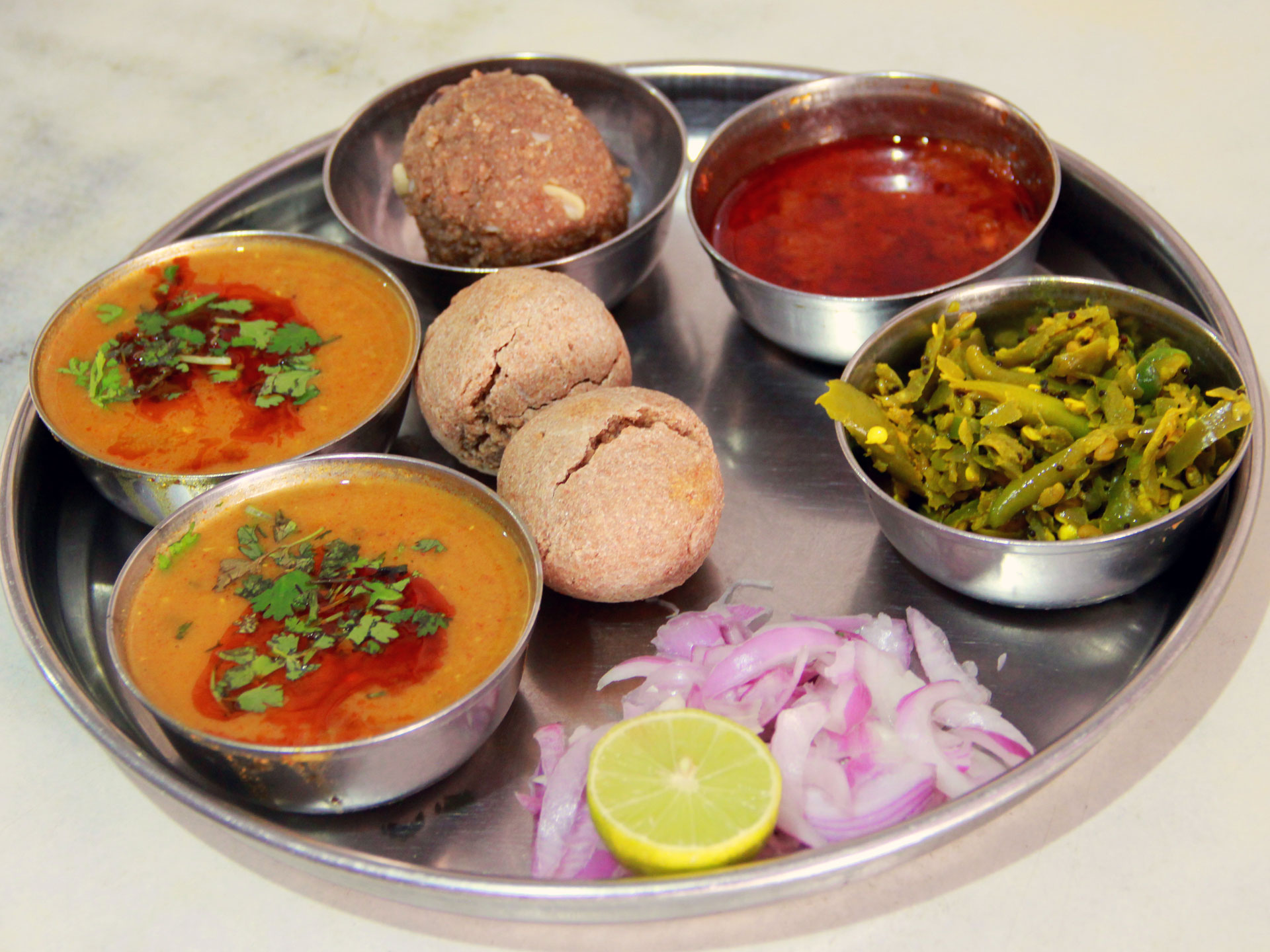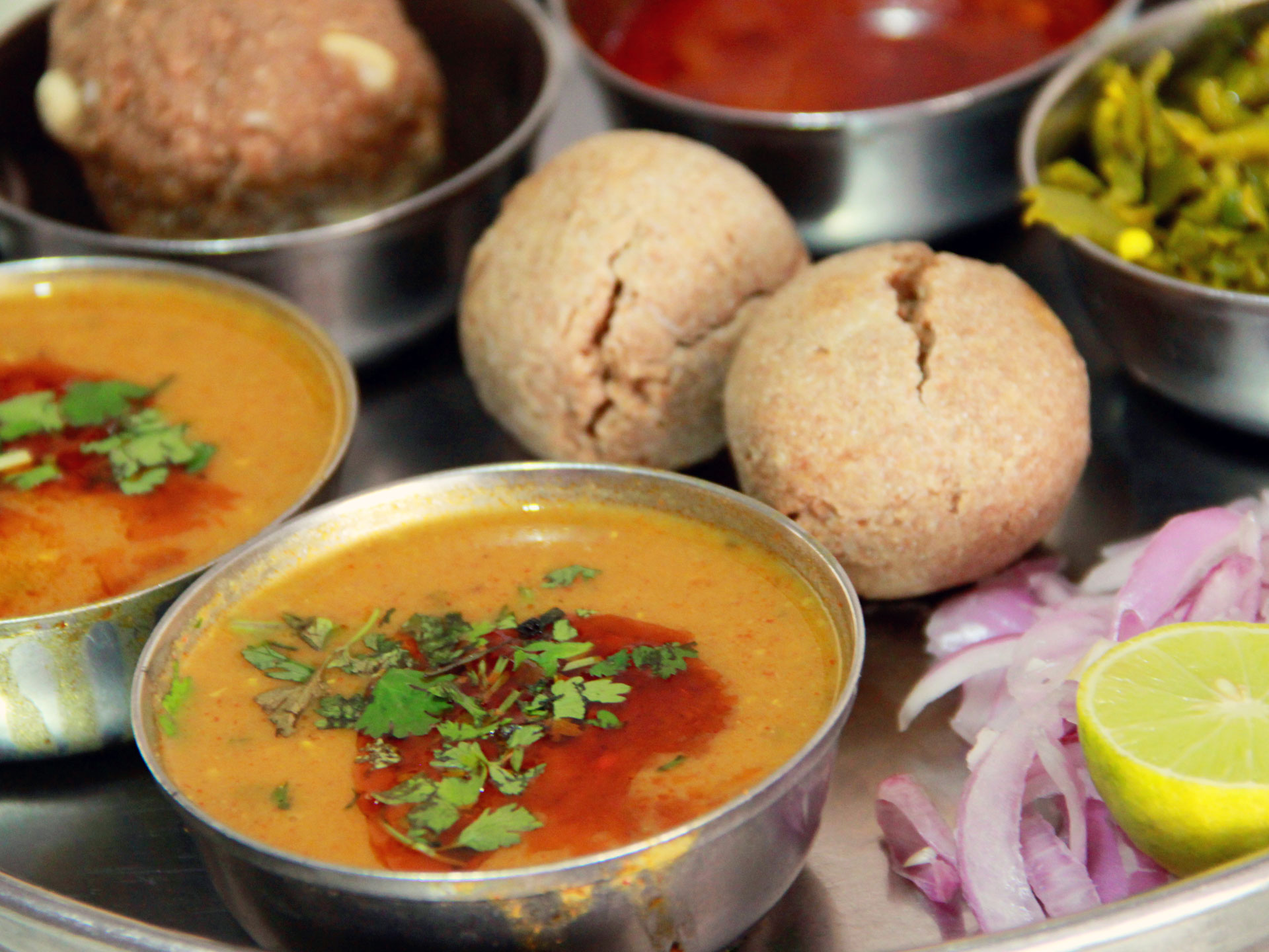 This platter comprised of delicious Daal, Baati and Churma/Choorma is a very filling and heavy Rajasthani delicacy. While the Baati and Churma are made with wheat flour and amply poured with pure Desi Ghee (clarified butter), the Churma is further sweetened with ground sugar and garnished with dry-fruits, like-cashew-nuts and almonds. The spicy Daal made from the lentils- Moond and Chana Daals is tempered using usual spices and asfoetida (Heeng) and garnished with coriander leaves. The delicacy is relished with salads, like- sliced onions, lemon and spicy Tipore made from green chilies tempered with the normal spices.What is Daal, Baatee, Choorma
