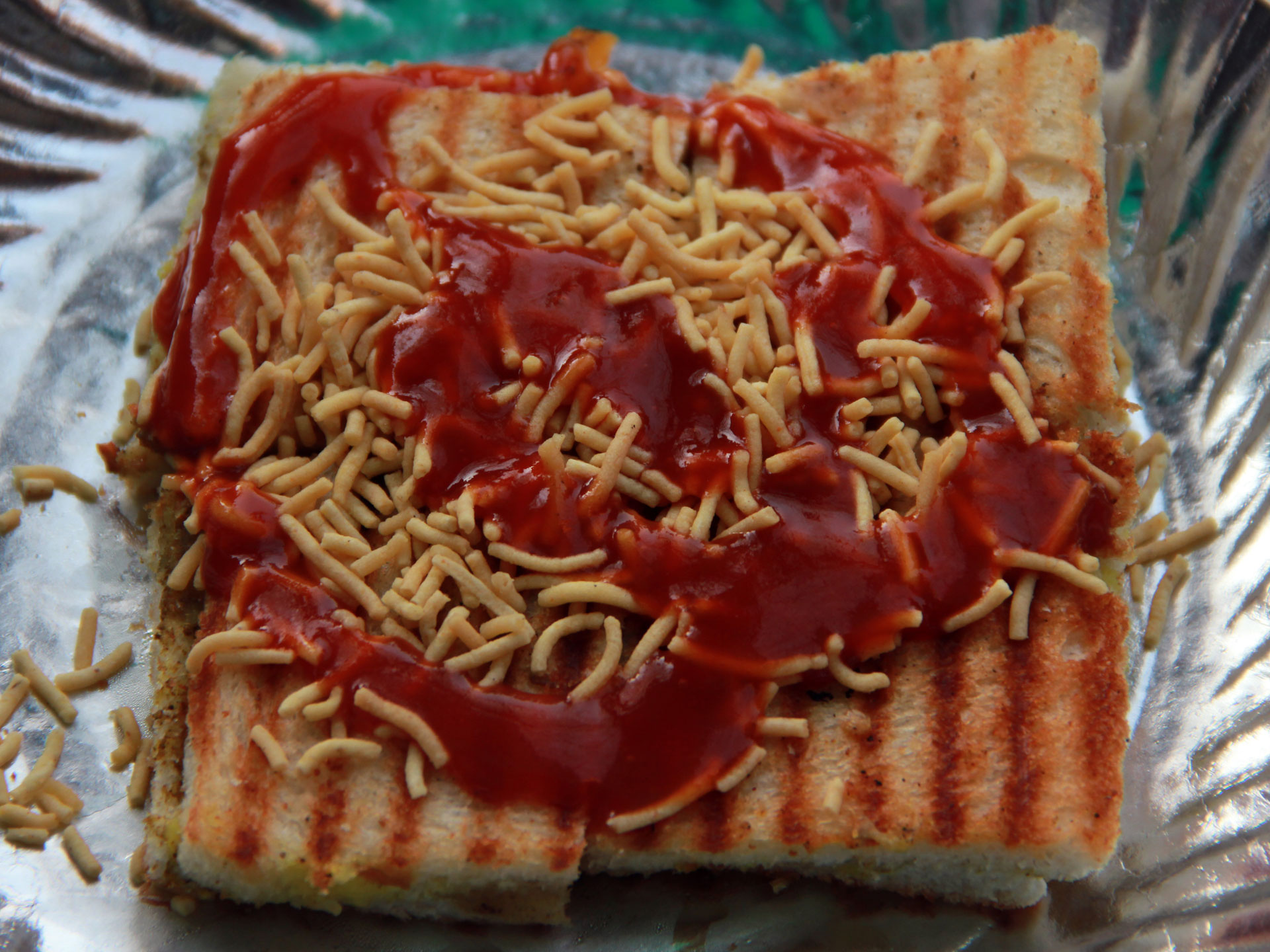 This spicy sandwich prepared from the ingredients, like- finely cut tomato, onion, capsicum seasoned with salt, Tandoori Masala and Namkeen stuffed between breads duly applied with butter and tomato ketchup and grilled in an oven, it is relished with or without tomato ketchup. The delicacy gets the name Tandoori Sandwich as the Tandoori Masala is used to get an additional flavor to this snack. The taste is available from 12:00 p.m. to 09:00 p.m.What is Sandwich